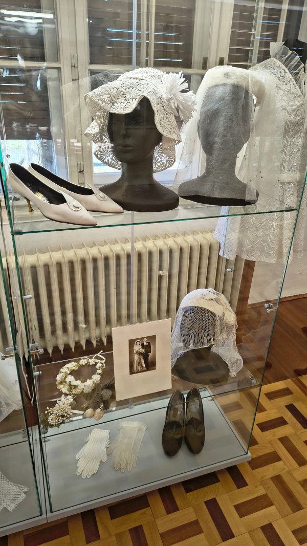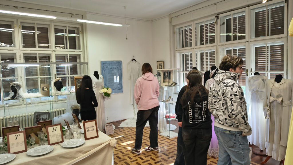 Výstava nabídla autentické svatební šaty, závoje, dobové doplňky i fotografie, na nichž žáci sledovali proměny siluet, detailů i kadeřnické práce.